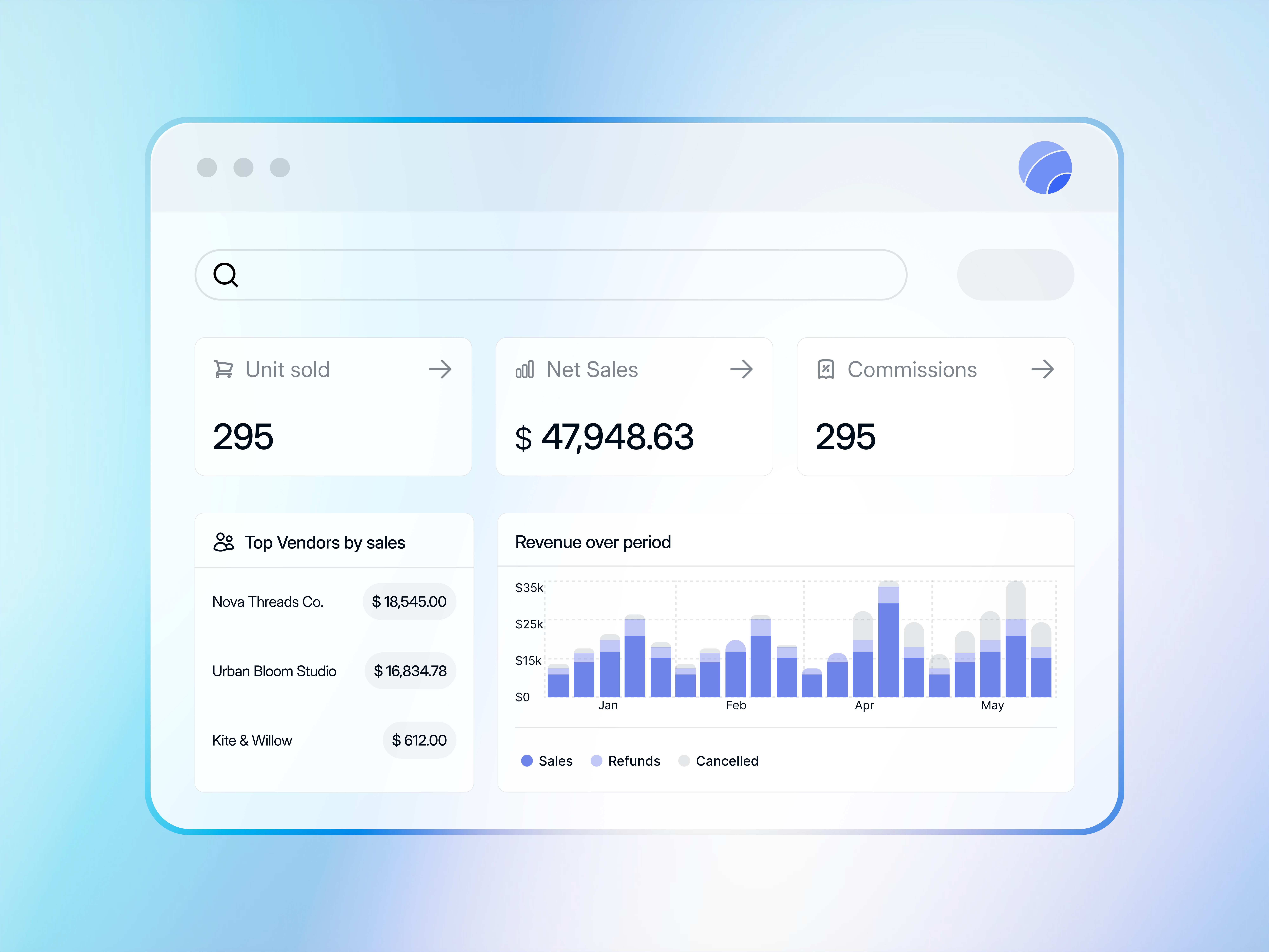 Real-time dashboards with vendor-level sales, commissions, and payouts