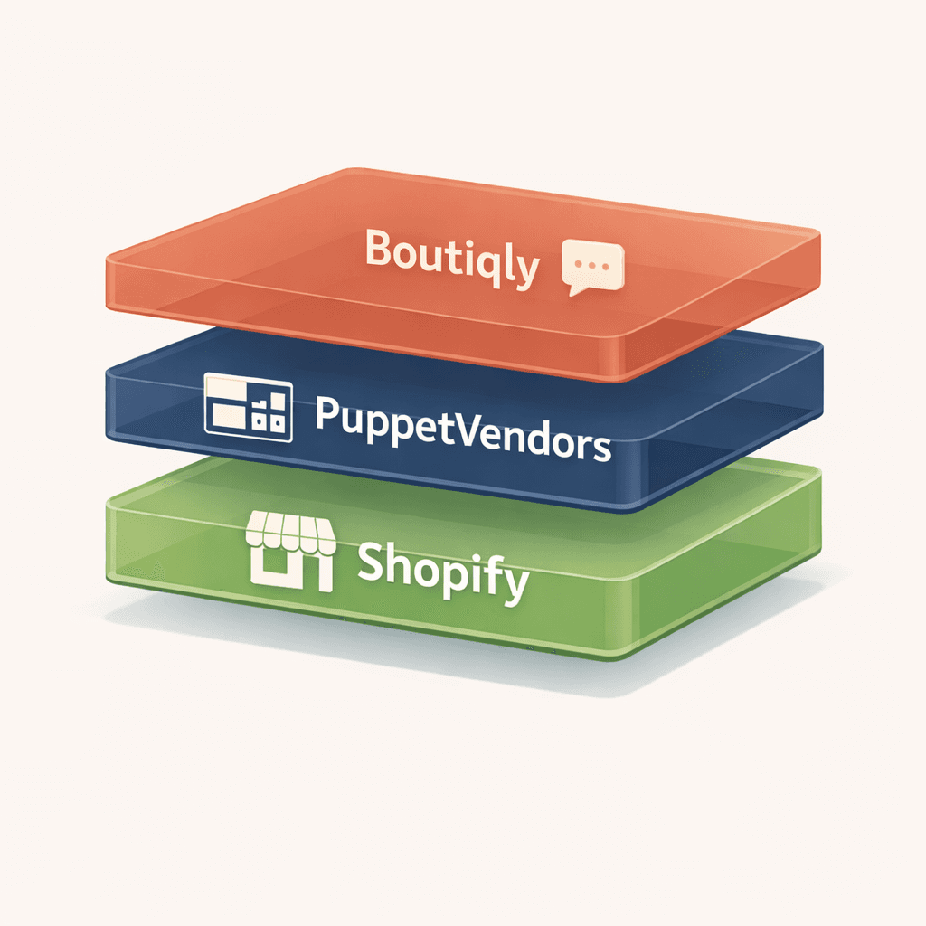 No. Shopify is the foundation. PuppetVendors solves the vendor and payout problem. Boutiqly solves the customer and communication problem. You can start with either PuppetVendors or Boutiqly and add the other when you're ready. Most vendor boutiques end up running both.